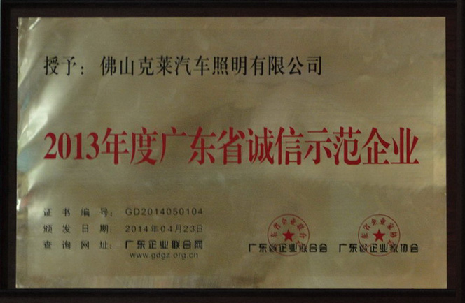 (通讯员:Tiger)2014年4月23日,佛山克莱汽车照明股份有限公司被广东省企业联合会及广东省企业家协会授予“2013年度广东省诚信示范企业”殊荣。评选活动是广东省企业联合会、广东省企业家协会为推动我省产业转型升级,促进企业诚信体系建设,决定对2013年度广东省优秀企业予以表彰。