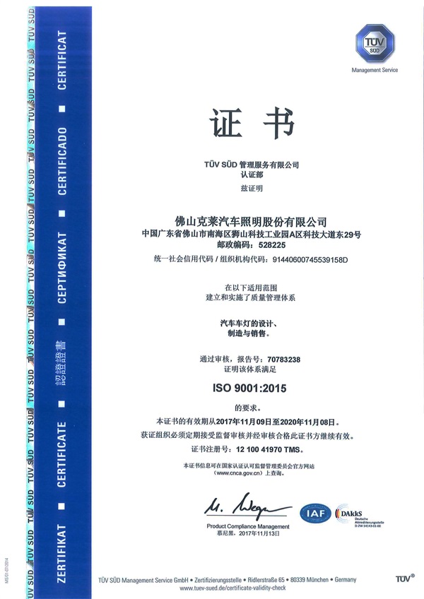 当前位置:首页 » 克莱汽车照明帮助中心 » 荣誉证书 » 克莱ISO9001认证